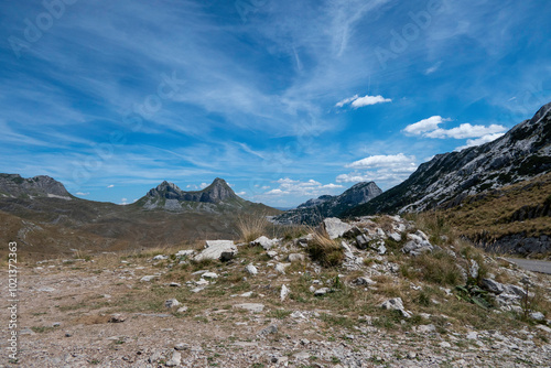 Durmitor, Montenegro, August 7, 2024. Durmitor National Park landscape. Twin peak of the Sedlena Greda
