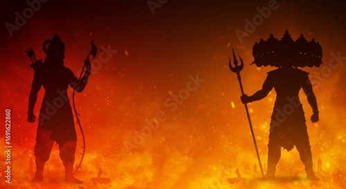 Dussehra banner background, Rama and Ravana silhouettes on fiery gradient