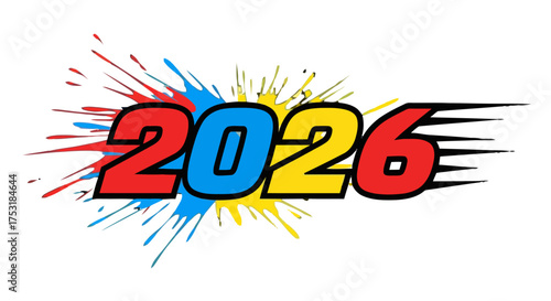Dynamic 2026 text with colorful splashes and motion lines