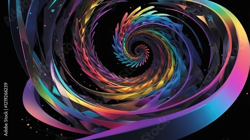 Dynamic 3D shapes like twisting cones, spirals, and angular prisms. Holographic textures with shifting rainbow colors. Suspended in a deep black void with subtle particle effects for a high-tech, mode