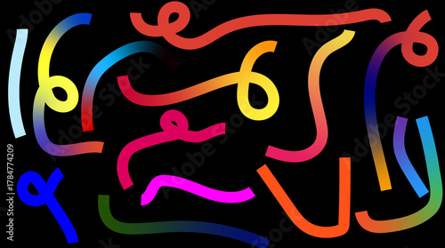 Dynamic abstract composition of swirling, rainbow-gradient lines against a deep black void, symbolizing digital flow and creative energy; this image for graphic design, UI, UX.