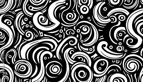 Dynamic black and white doodle pattern; bold, curved lines and swirls create a seamless vector design, design, flow