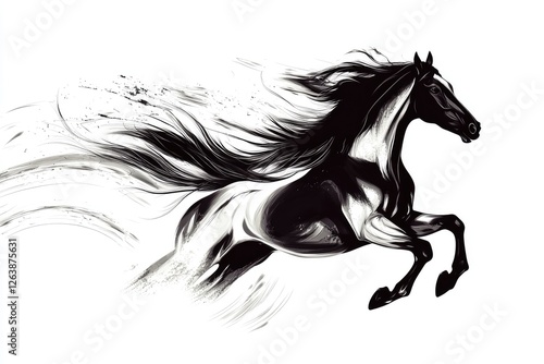 Dynamic Black Horse in Gallop with Flowing Mane Artistic Black and White Illustration Suitable for Various Design Projects and Themes