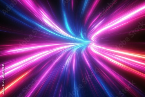 Dynamic neon light trails in vibrant blue, pink, and purple colors creating a futuristic motion effect on a dark background
