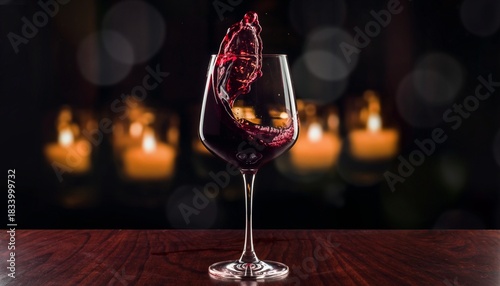 Dynamic red wine splash in elegant glass with romantic candlelight background