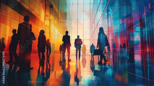 Dynamic silhouettes of employees engaged in audit work with an abstract background. The figures are in various active poses, such as examining documents, discussing findings, and working on computers.