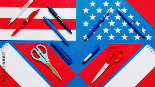 Dynamic stationery arrangement with patriotic colors, pens, scissors, and notebooks, perfect for Independence Day celebrations and creative projects