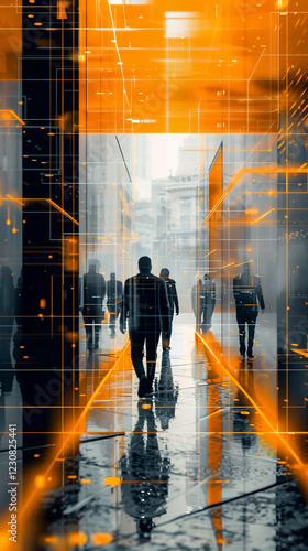 Dynamic urban scene with silhouettes walking through tech inspired corridor, illuminated by orange lights and reflections on wet pavement, creating futuristic atmosphere