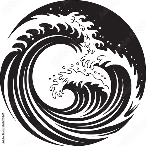 Dynamic wave crests in elegant black and white circle design for branding, logos and nautical themes