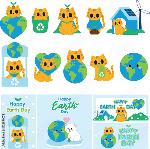 Earth Day, Cat, Planet, Globe, Heart, Recycle, Cape, House, Solar Panel, Wind Turbine, Cute, Cartoon, Green, Blue, Animal, Kitten, Happy, Environment, Nature, Illustration