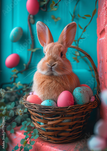 Easter postcard, Easter bunny, fluffy bunny, easter greeting card, postal card, colorful eggs in an easter basket, postal card size standard 105*148