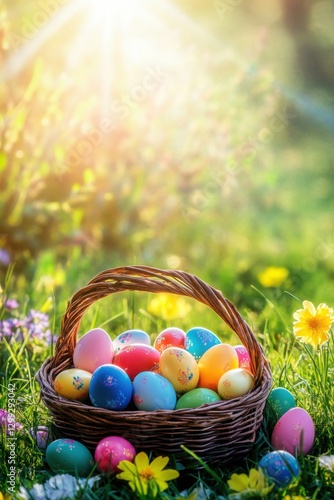 easter basket with colorful decorated eggs in green grass under warm sunlight