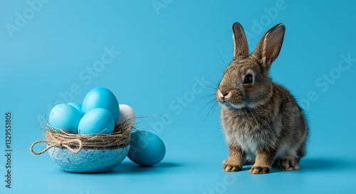 easter bunny and easter eggs isolated on blue background