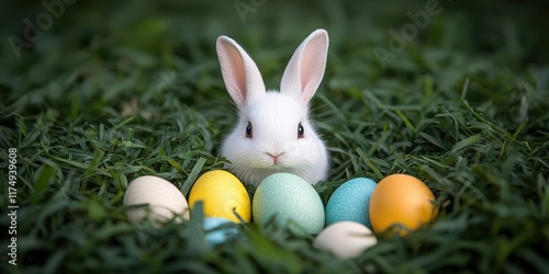 Easter Bunny and Eggs in Grass An adorable Easter bunny figurine surrounded by brightly colored eggs nestled in fresh green grass.