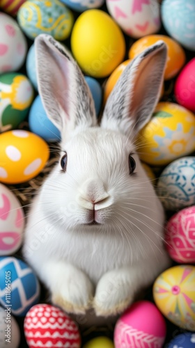 Easter Bunny in a Nest of Colorful Eggs: A fluffy white bunny peeks out from a nest of vibrantly decorated Easter eggs, capturing the essence of spring and festive joy.