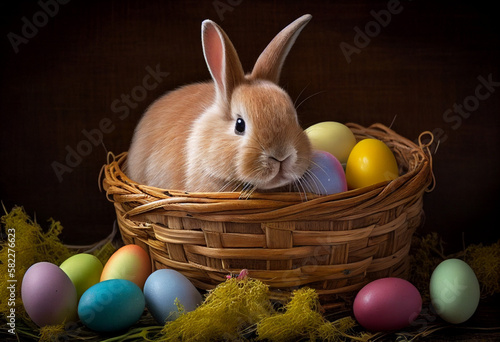 Easter bunny inside a basket with eggs. Generative AI