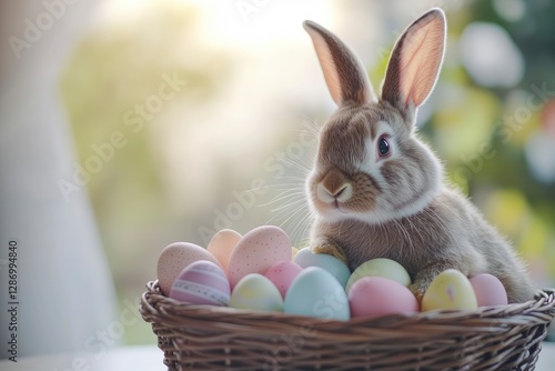 Easter bunny or rabbit with pastel eggs in a festive basket.