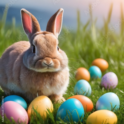 Easter bunny rabbit with painted eggs on grass lawn. Easter holiday concept.