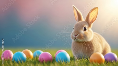 Easter bunny sitting with colorful eggs on grassy field easter celebration