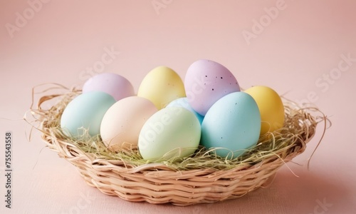 Easter card background: Easter eggs pastel colors in basket at pink background. Easter holiday background concept.