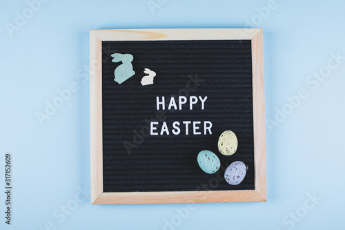 Easter Card Flat Lay Concept. Greeting board with text Happy Easter and pastel colorful eggs, wooden bunny on blue background. Top view.