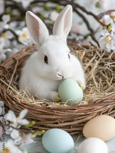 Easter celebration white rabbit nesting with colorful eggs floral background photography nature close-up whimsical