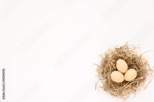 Easter composition. Nest with biege easter eggs on white background. Flat lay, top view