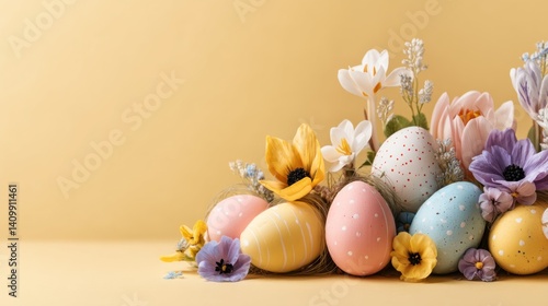 Easter decoration chick ornaments festive banners. Pastel Easter Eggs and Spring Flowers Holiday Arrangement in Soft Light on Yellow Background 85 chars.