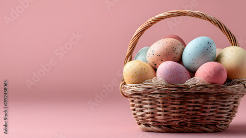 Easter eggs in a basket on a light pink clean background
