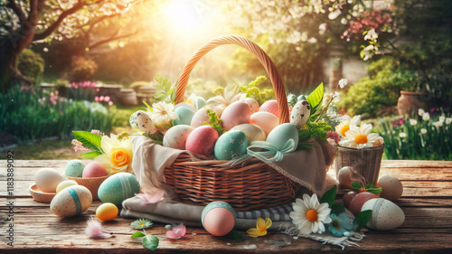 Easter Eggs In Basket On Aged Wooden Table In Spring Garden With Sunlight