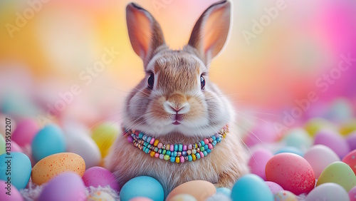 Easter illustration of a bunny surrounded by colorful eggs, likely to be used as stock photography. The image could also be used for a seasonal greeting card.