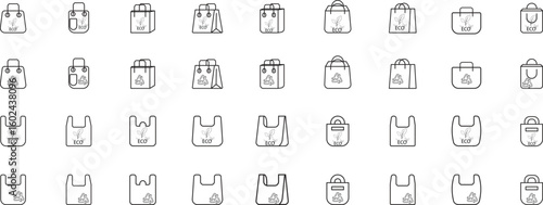 Eco Bag Icon Set – Reusable Tote, Shopping Bags, Sustainable Packaging, Recycling Symbols, Zero Waste Outlines, Thin Line Vector Pack with Transparent Background
