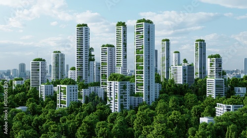 Eco friendly city with green buildings and trees. Sustainable architecture concept for urban development and environmental conservation.