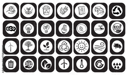 Eco Technology and Sustainability Icons Set – Renewable Energy, Solar Power, Recycling, and Green Living Symbols”
