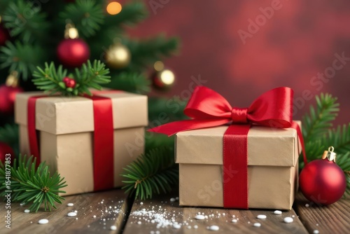 Eco-friendly Christmas gift boxes on rustic wood Plenty of copy space , natural, texture, present