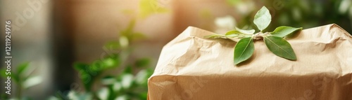 Eco-friendly packaging with green leaves highlighting sustainability.