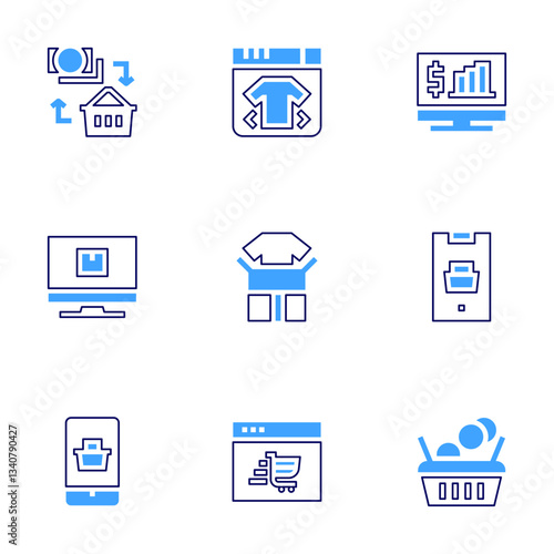 Ecommerce icon set. Bold line style. Duotone colors. Editable stroke. ecommerce, package, pc, shopping cart, shopping, online shop, unboxing, smartphone, order food