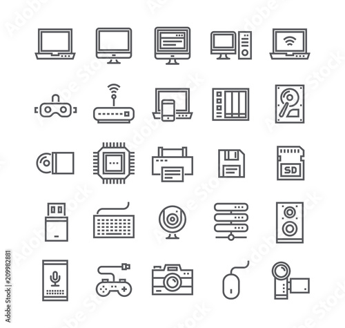 Editable simple line stroke vector icon set,Tech computer and various device laptops, routers, voice secretaries, cameras and more..48x48 Pixel Perfect.