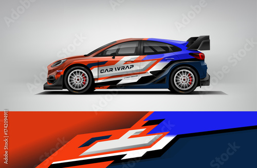 Editable vector EPS car wrap featuring orange and blue dynamic bolt design. Modern rally livery with bold diagonal shapes and contrast motion flow.