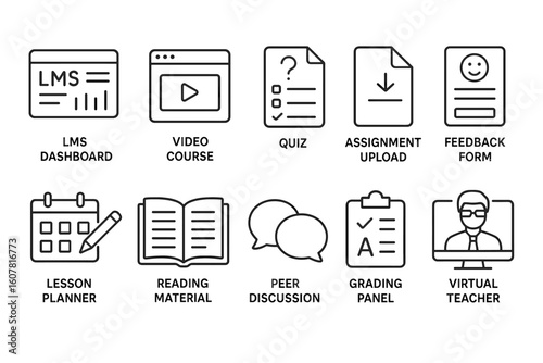 Educational Icons for LMS, Video Course, Quiz, and Assignment Management