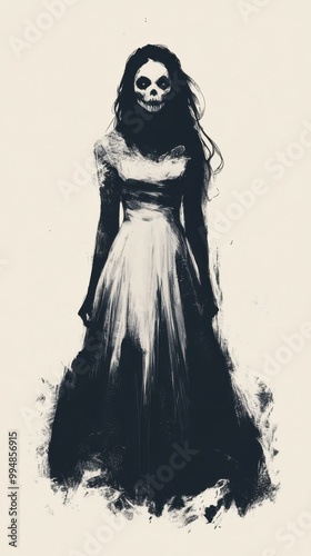 Eerie figure in a ghostly dress, haunting portrait with skull face, black and white art.