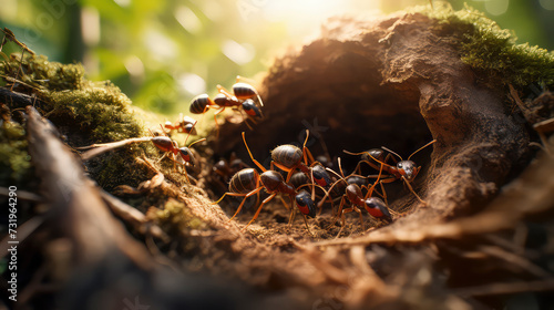 Efficient fire ants diligently navigate around their nest, showcasing their industrious teamwork in the wild. Vibrant red and black hues illustrate their active, social nature.
