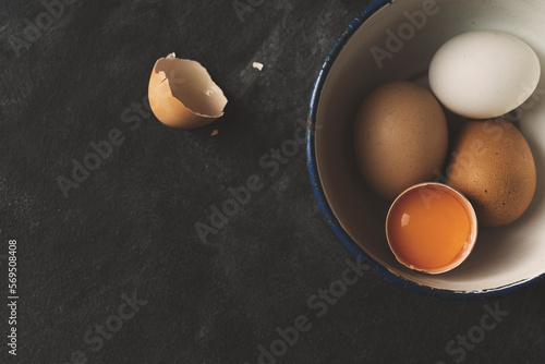 Eggs in a bowl, with cracked brown egg shells on countertop