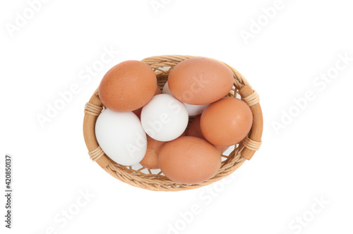 Eggs in wicker basket close up isolated on white background