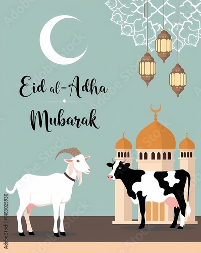 Eid al-Adha Mubarak Vector Poster with Mosque, Goat, and Cow