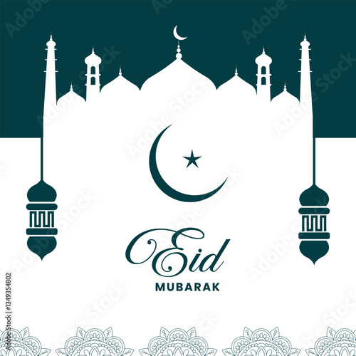 Eid Mubarak Greeting Card Design with Mosque Silhouette and Islamic Elements