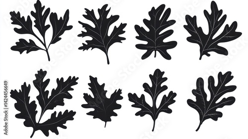Eight black leaf silhouettes, botanical illustration, white background, design element