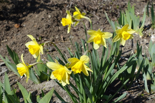 Eight bright yellow flowers of common daffodils in March