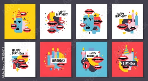Eight colorful abstract birthday card designs with geometric shapes, lips, and celebration items.