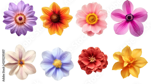 Eight colorful flowers of different types are displayed on a transparent background, creating a vibrant and versatile design element